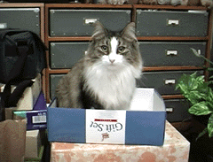 | たびをはじめ、どのねこもそうですが、ノンタも変なとこがだーい好き。 紙袋やダンボールの箱は、必ず入ってみないと気がすまないし、背の高い棚にも腕だけでぐんぐん登っていきます。まるでフリークライマーみたい。彼の筋肉はすごいですよー。 |
